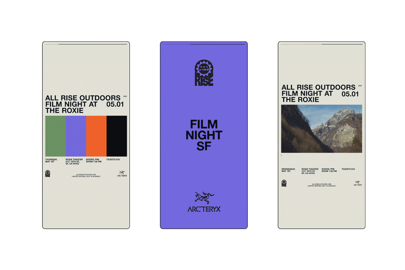 A digital campaign for the first All Rise Outdoors Film Night showcasing globally recognized outdoor films sponsored by Arc’teryx.